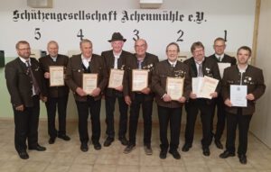 v.l.n.r.: stellv. Gautschützenmeister Andreas Henken, Manfred Theis, Josef Schmid, Johann Ranhartstetter sen., Klaus Stemmer, Josef Schröder, Klaus Schröder, Schützenmeister Fritz Kühnle, 2. Schützenmeister Markus Lankes (nicht auf dem Bild das ebenfalls geehrte Mitglied Tomas Schatz)